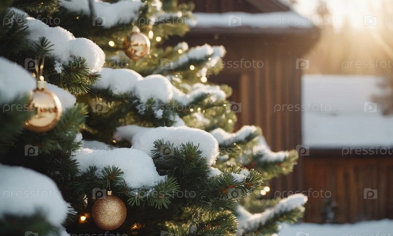 Украшенная елка в снегу. Солнечный зимний новогодний пейзаж