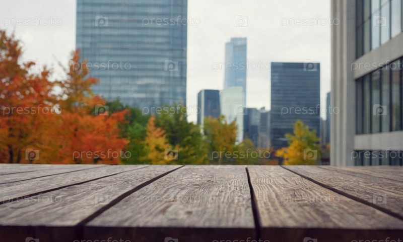 Красивый деревянный стол на фоне офиса. Бизнес-подиум для презентации продукта