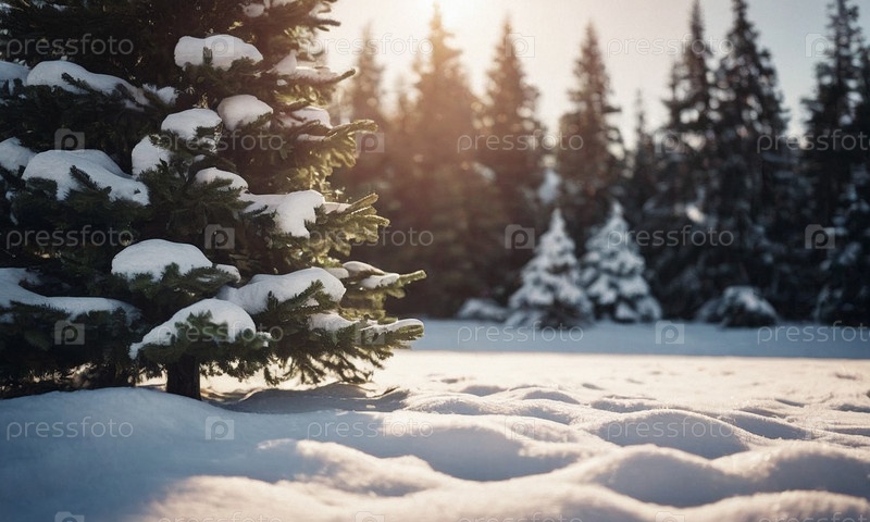Украшенная елка в снегу. Солнечный зимний новогодний пейзаж