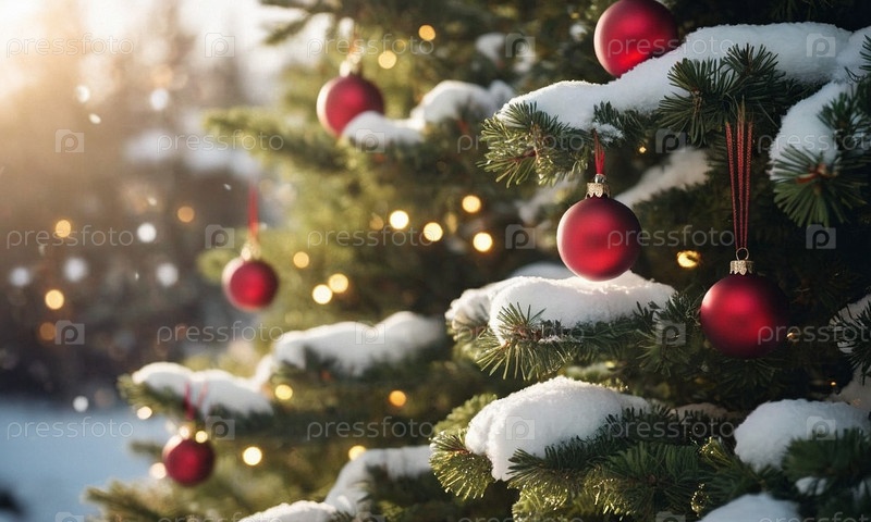 Украшенная елка в снегу. Солнечный зимний новогодний пейзаж