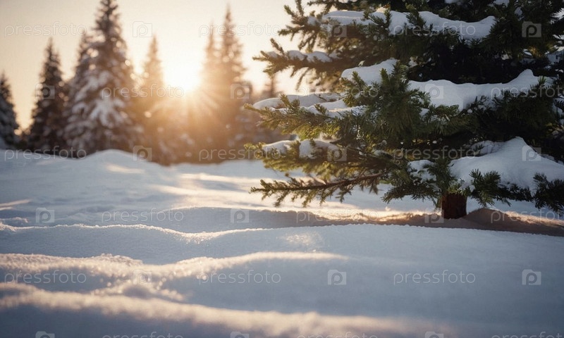 Украшенная елка в снегу. Солнечный зимний новогодний пейзаж