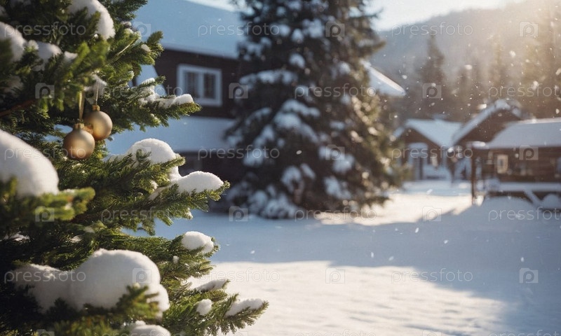 Украшенная елка в снегу. Солнечный зимний новогодний пейзаж
