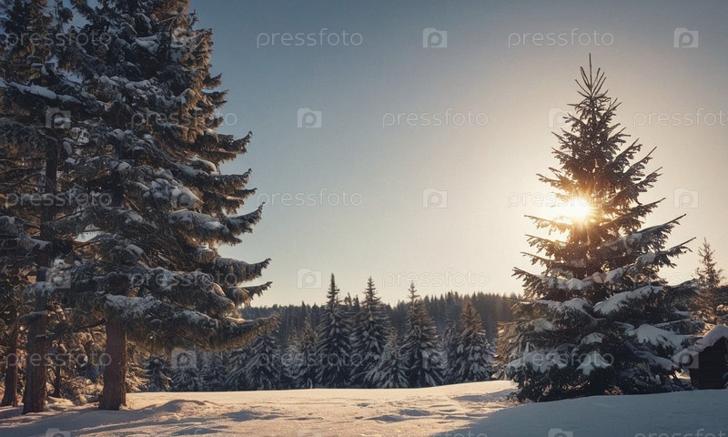 Украшенная елка в снегу. Солнечный зимний новогодний пейзаж