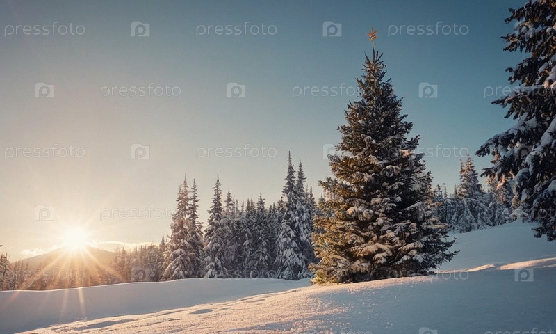 Украшенная елка в снегу. Солнечный зимний новогодний пейзаж