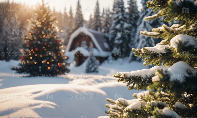 Украшенная елка в снегу. Солнечный зимний новогодний пейзаж