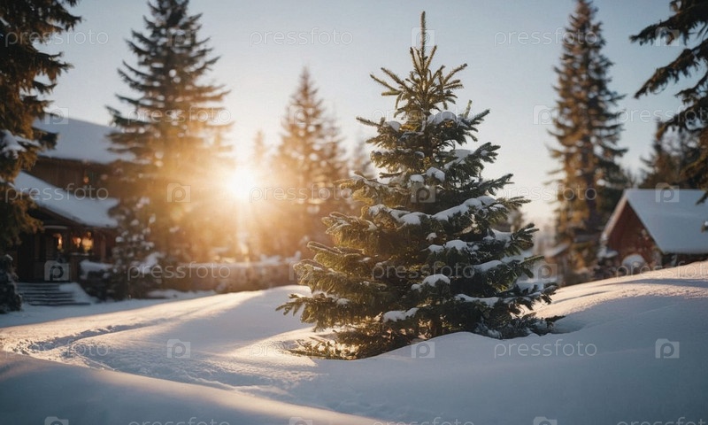 Украшенная елка в снегу. Солнечный зимний новогодний пейзаж