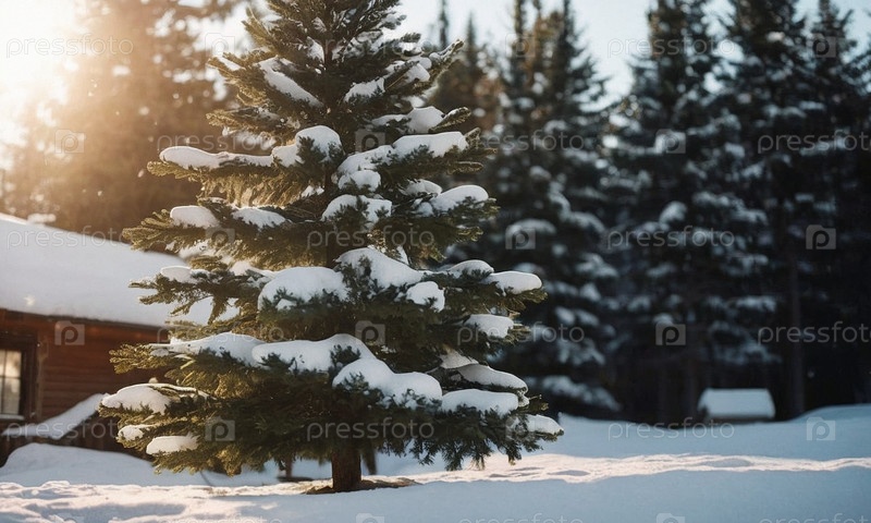 Украшенная елка в снегу. Солнечный зимний новогодний пейзаж