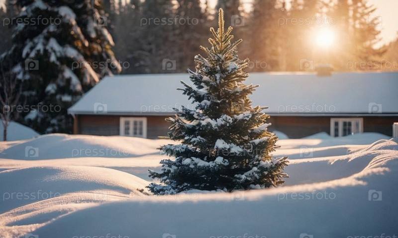 Украшенная елка в снегу. Солнечный зимний новогодний пейзаж