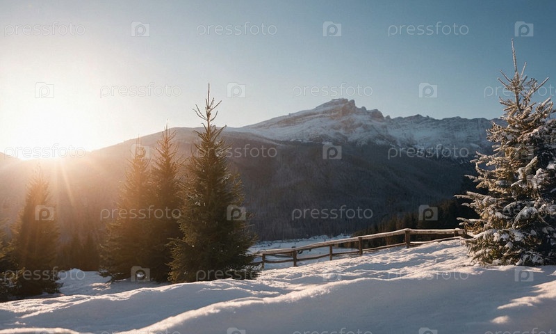 Украшенная елка в снегу. Солнечный зимний новогодний пейзаж