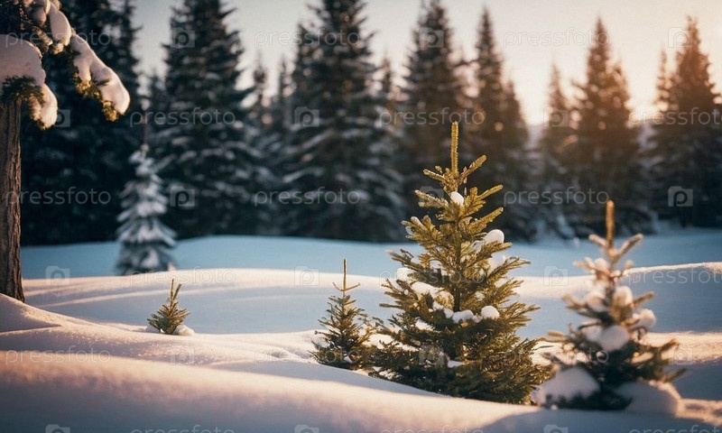 Украшенная елка в снегу. Солнечный зимний новогодний пейзаж