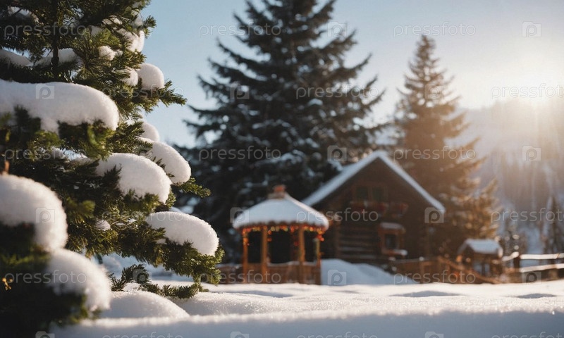 Украшенная елка в снегу. Солнечный зимний новогодний пейзаж