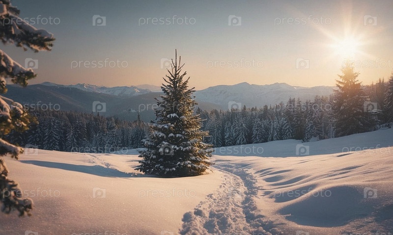 Украшенная елка в снегу. Солнечный зимний новогодний пейзаж