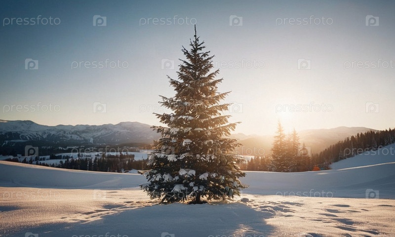 Украшенная елка в снегу. Солнечный зимний новогодний пейзаж