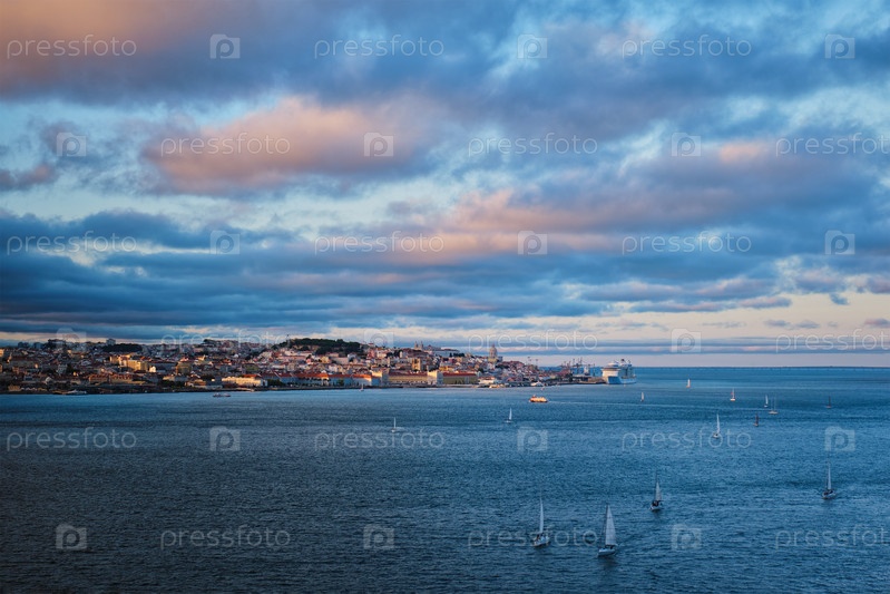 Вид на Лиссабон через реку Тежу из Алмады с яхтами и туристическими лодками на закате с драматическим небом. Лиссабон, Португалия