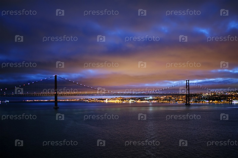 Вид на мост 25 апреля, знаменитую туристическую достопримечательность Лиссабона, соединяющую Лиссабон и Алмаду на полуострове Сетубал через реку Тежу в вечерних сумерках. Лиссабон, Португалия