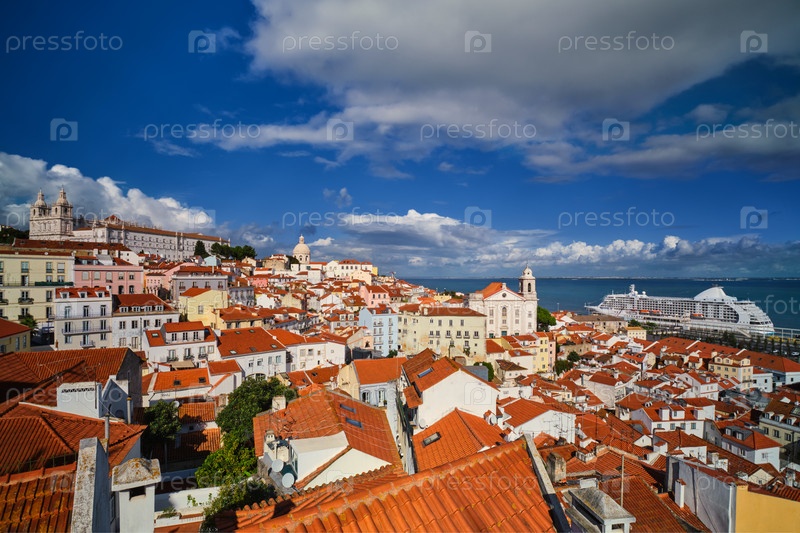 Вид на Лиссабон со смотровой площадки Мирадуро-де-Санта-Лузия с пришвартованным круизным лайнером и движущимися облаками. Лиссабон, Португалия