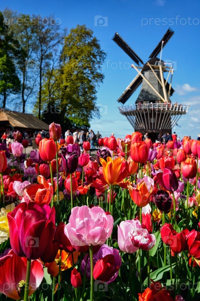 Цветущая клумба тюльпанов и ветряная мельница в саду Кекенхоф, также известном как Сад Европы, один из крупнейших в мире цветочных садов для туристов с ветряными мельницами. Лиссе, Нидерланды