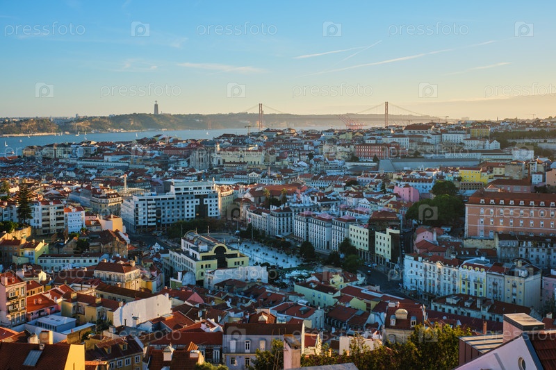 Вид на знаменитый вид Лиссабона с туристической смотровой площадки Мирадуро-да-Сеньора-ду-Монте на старый городской район Алфамы и Маурарии, мост 25 апреля на закате. Лиссабон, Португалия