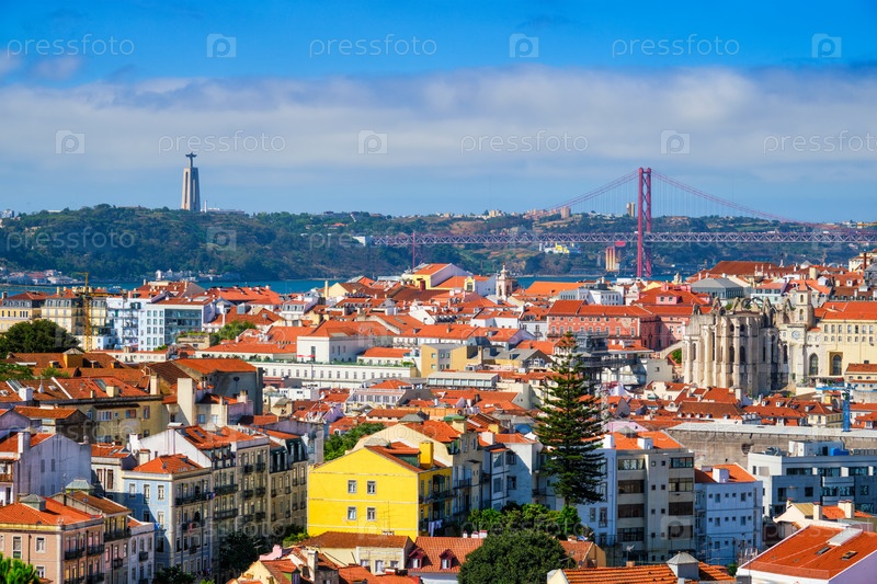 Знаменитый вид Лиссабона с туристической смотровой площадки Мирадуру-дус-Баррос на старый район города Алфама, мост 25 апреля и статую Христа-короля. Лиссабон, Португалия