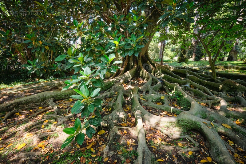 Экзотическое дерево Ficus macrophylla Ствол австралийского баньянного смоковника и опорные корни в крупном плане Тропический ботанический сад, Лиссабон, Португалия