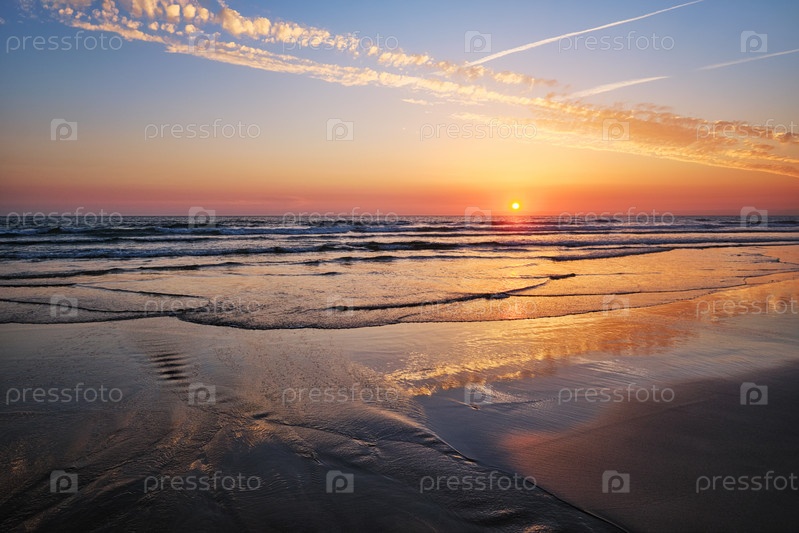 Закат Атлантического океана с бушующими волнами на пляже Фонте-да-Телья, Португалия