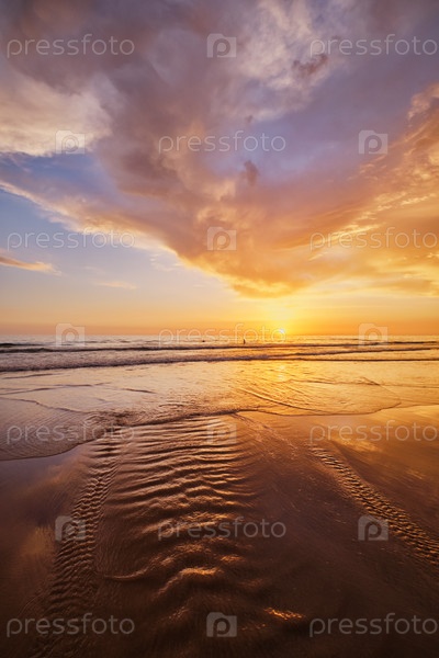 Закат Атлантического океана с бушующими волнами на пляже Фонте-да-Телья, Португалия