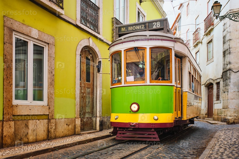 Знаменитый винтажный желтый трамвай 28 на узких улочках района Алфама в Лиссабоне, Португалия - символ Лиссабона, известного популярного туристического направления и туристической достопримечательности