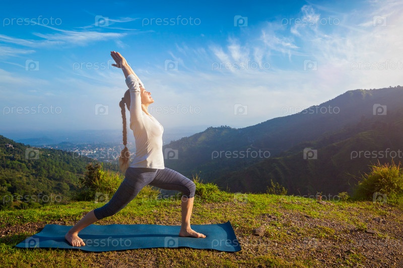 Женщина занимается йогой асаной Вирабхадрасана 1 - Поза воина на открытом воздухе