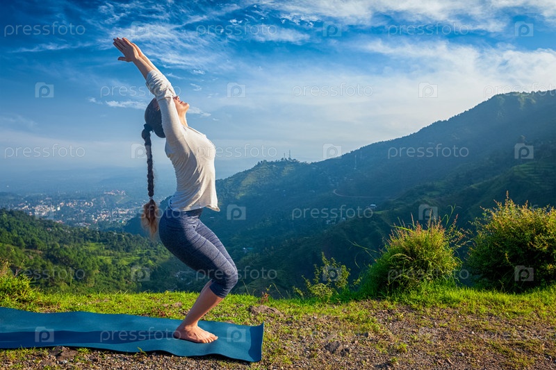Молодая женщина занимается йогой асаной Уткатасана (поза стула) на открытом воздухе в горах Гималаи утром. Химачал-Прадеш, Индия
