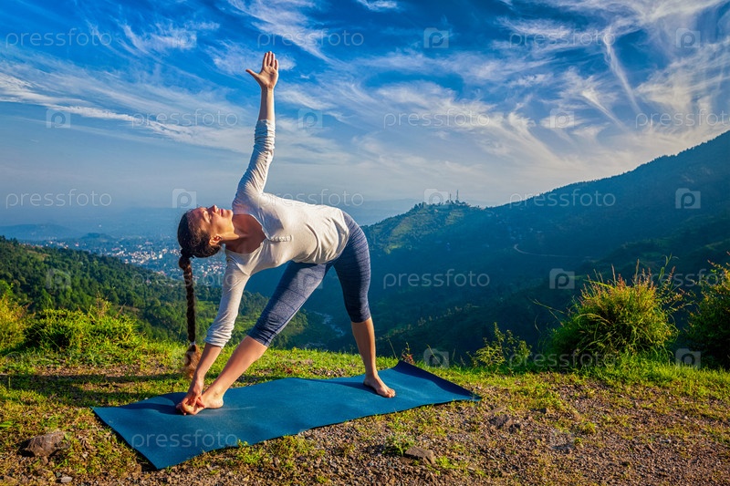 Женщина делает асану йоги Аштанга Виньяса Уттхита триконасана