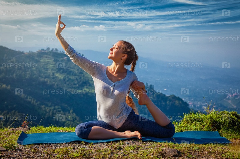 Сортированная женщина занимается асаной йоги на открытом воздухе в горах