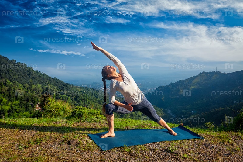 Женщина практикует асану йоги Уттхита Паршваконасана - поза с расширенным боковым углом на открытом воздухе в горах утром
