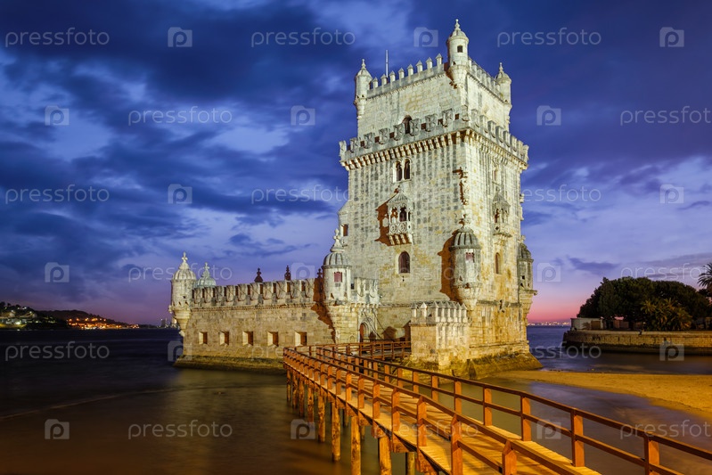 Башня Белен или Башня Святого Винсента - известная туристическая достопримечательность Лиссабона и туристическая достопримечательность - на берегу реки Тежу (Тежу) после захода солнца в сумерках с драматическим небом. Лиссабон, Португалия