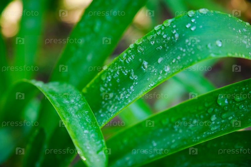 Пышные зеленые листья травы с каплями водяной росы на ветру утром