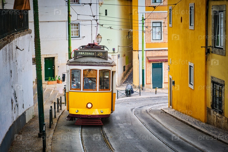 Знаменитый винтажный желтый трамвай 28 на узких улочках района Алфама в Лиссабоне, Португалия