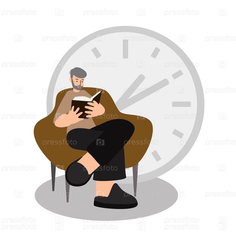 Пожилой мужчина читает книгу о современном кресле, изолированном векторной иллюстрацией