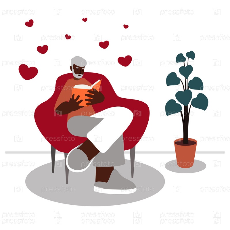 Пожилой мужчина читает роман о любви, темнокожий изолированный вектор