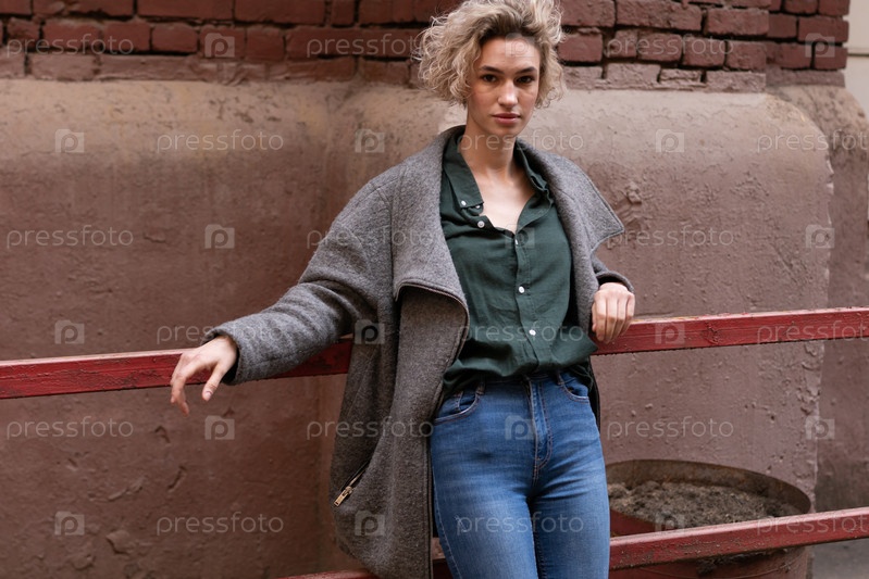 Молодая красивая женщина позирует в сером пальто на улице