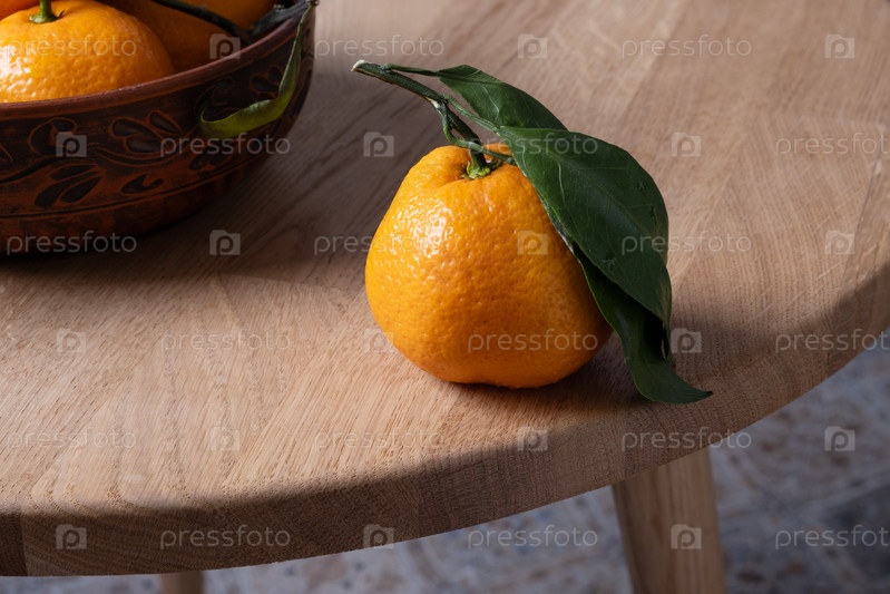 На столе лежат несколько спелых мандаринов с листьями. Селективный фокус