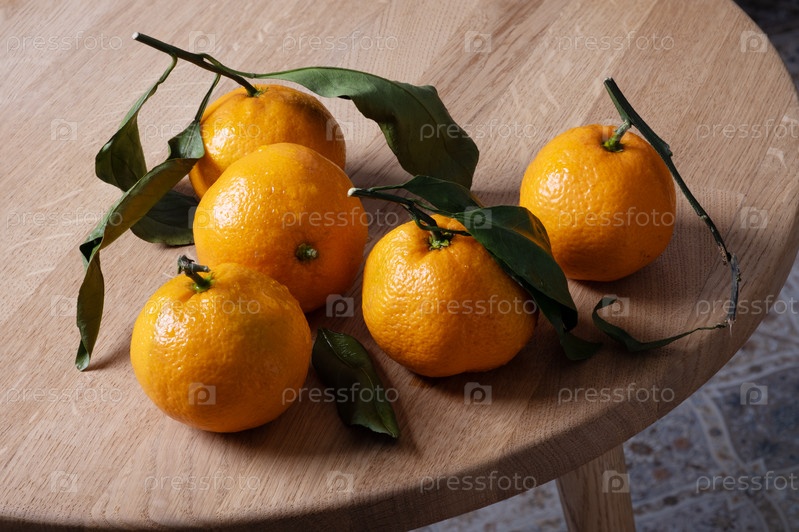 На столе лежат несколько спелых мандаринов с листьями. Селективный фокус