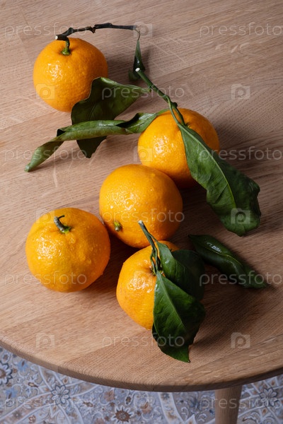 На столе лежат несколько спелых мандаринов с листьями. Селективный фокус