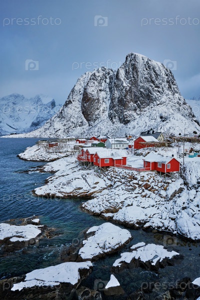 Знаменитая рыбацкая деревня Хамной на Лофотенских островах, Норвегия, с красными домами рорбу. С падающим снегом зимой