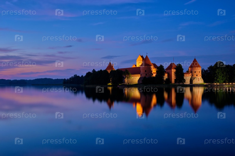 Замок острова Тракай на озере Гальве, Литва, на закате с драматическим небом, отражающимся в воде. Тракайский замок – одна из главных туристических достопримечательностей Литвы
