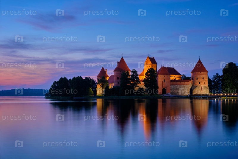 Замок острова Тракай на озере Гальве, освещенный в сумерках, отражающийся в мирной воде, Литва