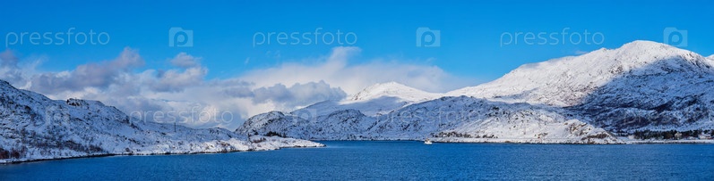 Панорама Лофотенских островов и Норвежского моря зимой с заснеженными горами. Лофотенские острова, Норвегия