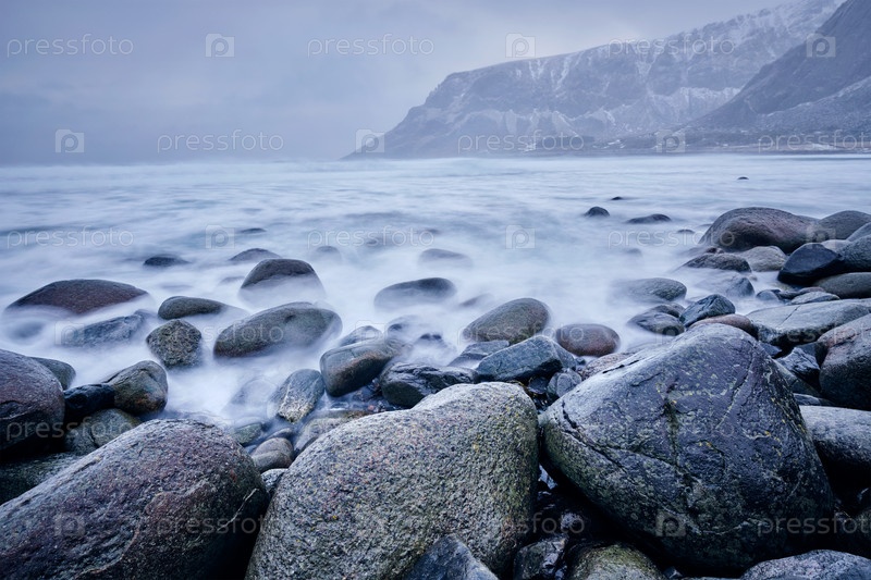 Волны Норвежского моря накатываются на каменные скалы. Длительное воздействие