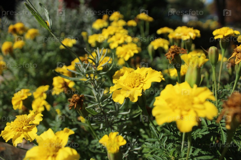 Желтые цветы, бархатцы на клумбе, крупный план. Цветы летом осенью Облагораживание территории. Зелень городских цветов