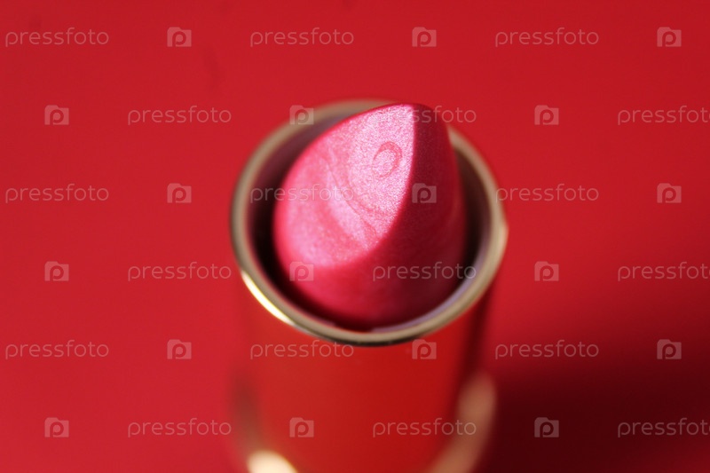 Красно-розовая помада с черно-золотой упаковкой тюбика на черно-красном фоне с местом для копирования текста. Макияж Уход за собой Тип красоты по цветотипу