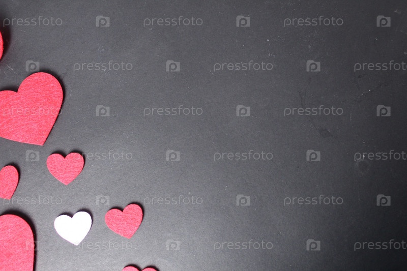 Фон для праздника Дня святого Валентина восьмого марта. Красные и розовые сердца на черном фоне, вид сверху с местом для копирования текста