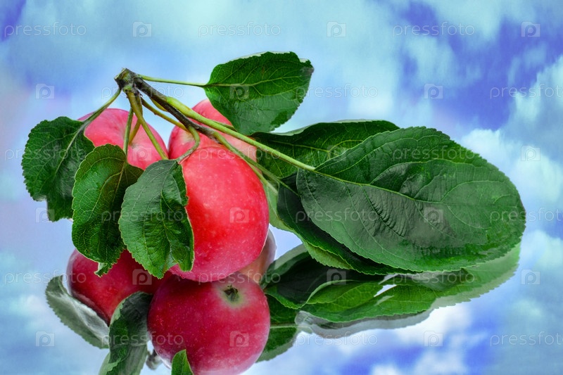 Красные спелые ранетки сорваны и лежат на фоне отраженного неба